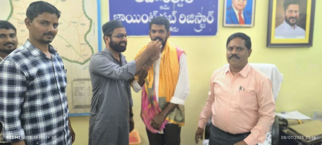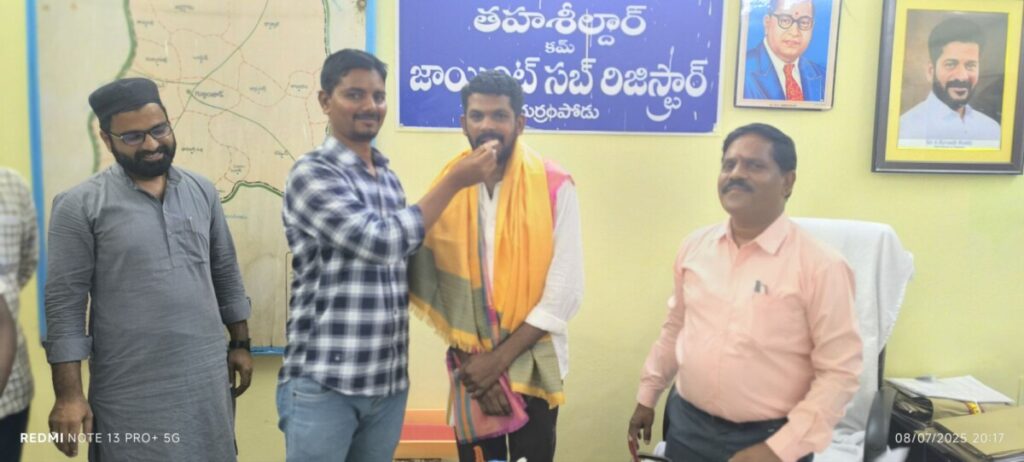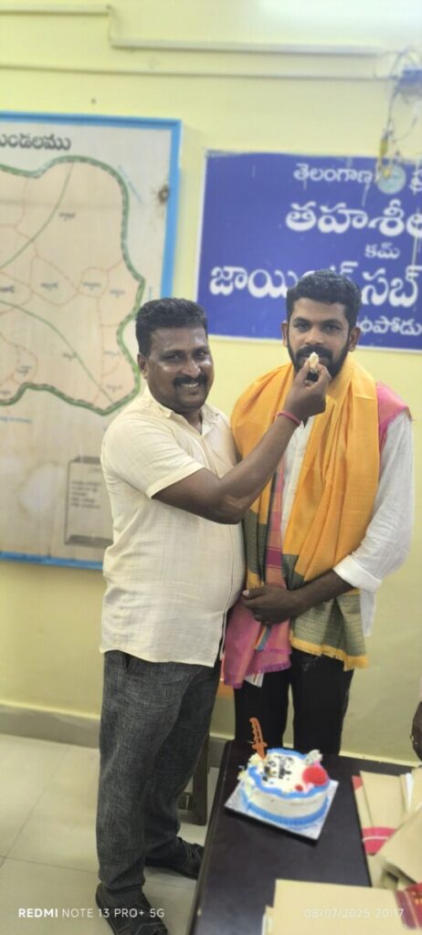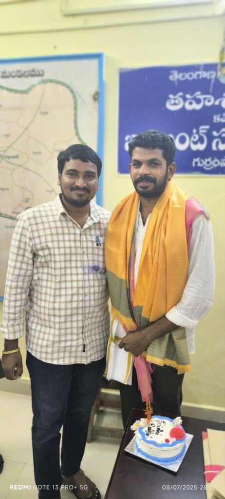 గుర్రంపోడు, జూలై08 (నేటి దర్శిని): గుర్రంపోడు మండల కేంద్రానికి చెందిన ఫ్రెండ్స్ మీ సేవ నిర్వాహకులు కూనూరు సైదిరెడ్డి జన్మదిన వేడుకలు ఈ రోజు మండల తహసిల్దార్ కార్యాలయంలో అత్యంత హర్షాతిరేకాల మధ్య ఘనంగా నిర్వహించారు. ఈ సందర్భంగా తహసిల్దార్ పీ. శ్రీనివాస్ పాల్గొని కూనూరు సైదిరెడ్డికి పుష్పగుచ్ఛం అందజేసి శాలువ కప్పి జన్మదిన శుభాకాంక్షలు తెలియజేశారు. అదే విధంగా నాయబ్ తహసిల్దార్ ఫరీదుద్దీన్ కూడా ఈ వేడుకలో పాల్గొని సైది రెడ్డి కి జన్మదిన శుభాకాంక్షలు తెలియజేశారు. తన జన్మదినం సందర్భంగా సామాజిక సేవలో భాగంగా కూనూరు సైదిరెడ్డి ఎమ్మార్వో కార్యాలయ సిబ్బంది వినియోగించుకునేందుకు 20 ప్లాస్టిక్ చైర్లు అందజేశారు. ప్రభుత్వ ఉద్యోగుల సౌకర్యార్థం ఈ మంచి పనిని ఆయన చేపట్టిన విధానం అందరి మెప్పును పొందింది. ఈ కార్యక్రమంలో తహసిల్దార్ కార్యాలయ సిబ్బంది ఆ.ఐ. నజీర్, రామకృష్ణ, వెంకట కృష్ణ, సందీప్, రామ్ రెడ్డి తదితరులు పాల్గొని జన్మదిన శుభాకాంక్షలు తెలియజేశారు. కార్యాలయ స్టాఫ్ మెంబర్స్ అందరూ ఈ సందర్భంగా కేక్ కట్ చేసి సైదిరెడ్డికి అభినందనలు తెలిపారు.